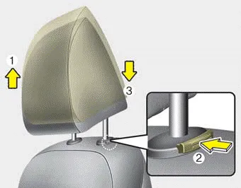 To raise the headrest, pull it up to the desired position (1). To lower the headrest, push and hold the release button (2) on the headrest support and lower the headrest to the desired position (3).