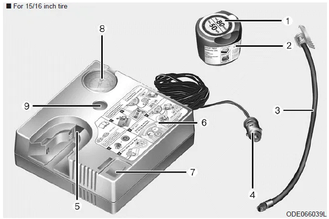Please read the instructions before using the Tire Mobility Kit. (1) Compressor (2) Sealant bottle The Tire Mobility Kit is a temporary fix to the tire and the tire should be inspected by an authorized Kia dealer as soon as possible. CAUTION - One sealant for one tire When two or more tires are flat, do not use the Tire Mobilit