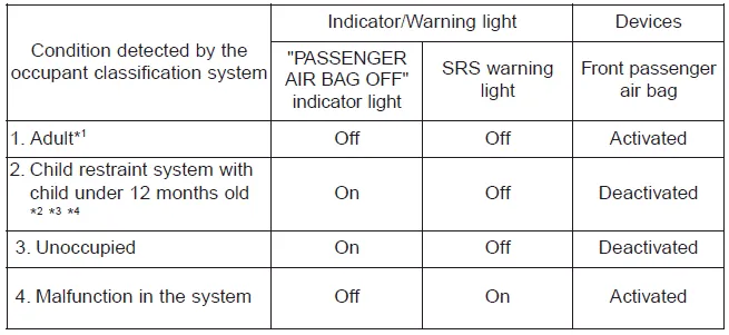 If the occupant detection system is not working properly, the SRS air bag warning light on the instrument panel will illuminate because the passenger's front air bag is connected with the occupant detection system. If there is a malfunction of the occupant detection system, the PASSENGER AIR BAG “OFF” indicator will not illuminate and the passenger's front air bag may inflate in frontal impact crashes even if there is no occupant in the front passenger's seat.