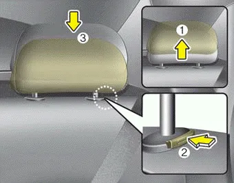 To raise the headrest, pull it up to the desired position (1). To lower the headrest, push and hold the release button (2) on the headrest support and lower the headrest to the desired position (3).