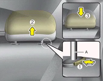 To reinstall the headrest, put the headrest poles (3) into the holes while pressing the release button (1). Then adjust it to the appropriate height and ensure that it locks in position.