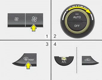To defog inside windshield 1. Set the fan speed to the desired position. 2. Select desired temperature. 3. Select the or position. 4. The outside (fresh) air and air conditioning will be selected automatically.