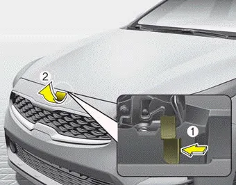 2. Go to the front of the vehicle, raise the hood slightly, push the secondary latch (1) inside of the hood center and lift the hood (2).