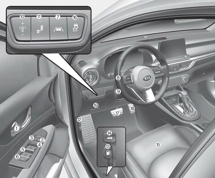 1. Instrument cluster 2. Horn 3. Driver’s front air bag 4. Light control/Turn signals 5. Wiper/Washer 6. Ignition switch or ENGINE START/STOP button 7.