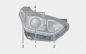 ■ Rear combination lamp - Type A ■ Rear combination lamp - Type B (1) Stop and tail lamp (Bulb type) (2) Tail lamp (Bulb type) (3) Side marker (Bulb type) (4) Stop lamp (LED type) (5,6) Tail lamp (LED type) (7) Side marker (LED type) ■ Rear turn signal lamp / Back up lamp ■ License plate lamp (8) Rear turn signal lamp (Bulb type) (9) Back Up lamp (Bulb type) (10) License plate lamp (Bulb type) ■ High mounted stop lamp (11) High mounted stop lamp (Bulb or LED type)