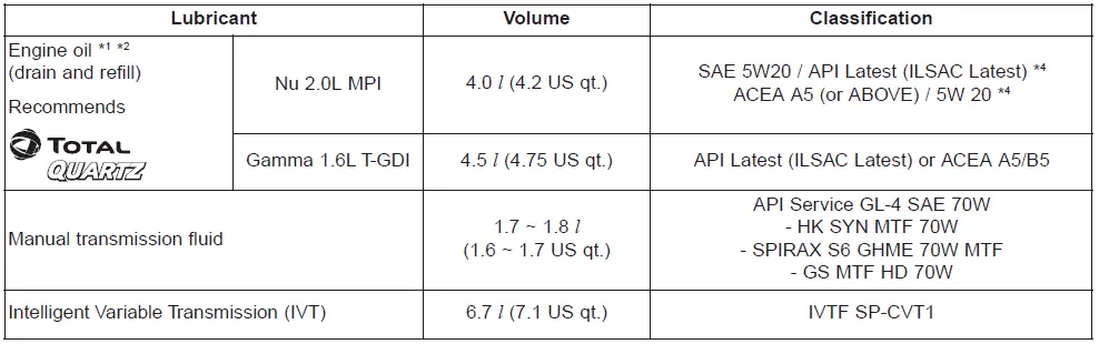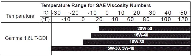 For Fuel economy, it is recommended to use the engine oil of a viscosity grade SAE 5W-30 (API Latest (ILSAC Latest) or ACEA A5/B5). However, if the engine oil is not available in your country, select the proper engine oil using the engine oil viscosity chart.