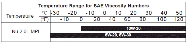 Engine oil viscosity (thickness) has an effect on fuel economy and cold weather operating (engine start and engine oil flowability). Lower viscosity engine oils can provide better fuel economy and cold weather performance; however, higher viscosity engine oils are required for satisfactory lubrication in hot weather. Using oils of any viscosity other than those recommended could result in engine damage. When choosing an oil, consider the range of temperature your vehicle will be operated in before the next oil change. Proceed to select the recommended oil viscosity from the chart.