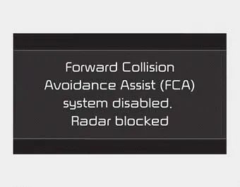 When the sensor is covered or the sensor lens is dirty with foreign substances, such as snow or rain, the FCA system may not be able to detect vehicles. In this situation, a warning message (“Forward Collision-Avoidance Assist (FCA) system disabled. Radar blocked”) will appear to notify the driver. Remove the foreign substances to allow the FCA system to function property.