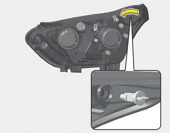 1. Open the hood. 2. Remove the headlamp bulb cover by turning it counterclockwise. 3. Remove the bulb-socket from the headlamp assembly by turning the bulb-socket counterclockwise until the tabs on the bulb-socket align with the slots on the headlamp assembly.