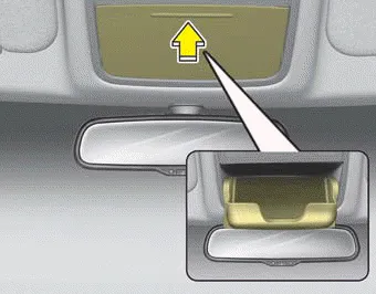 To open the sunglass holder, press the cover and the holder will slowly open. Place your sunglasses with the lenses facing out.